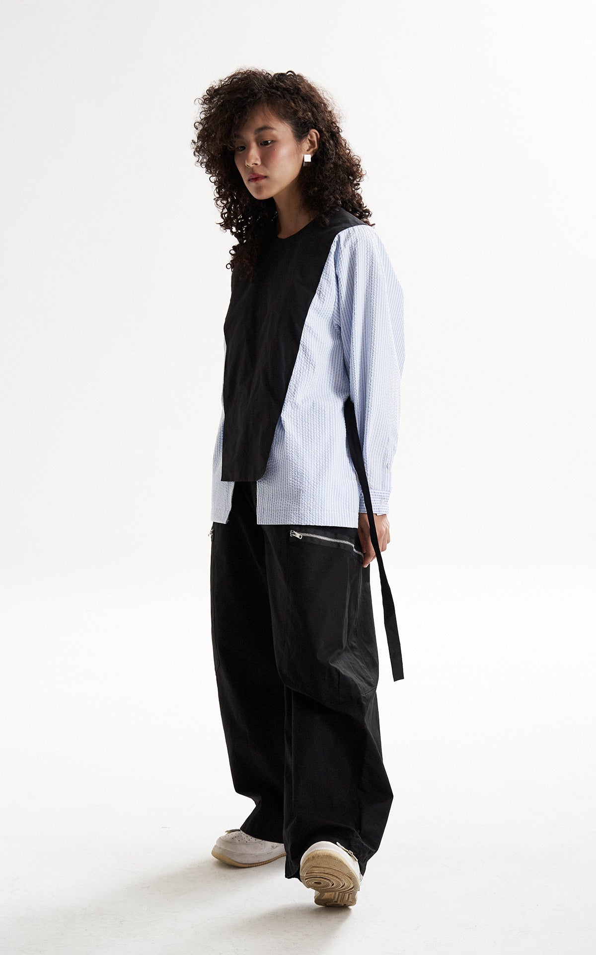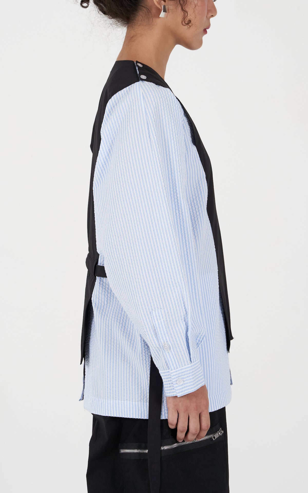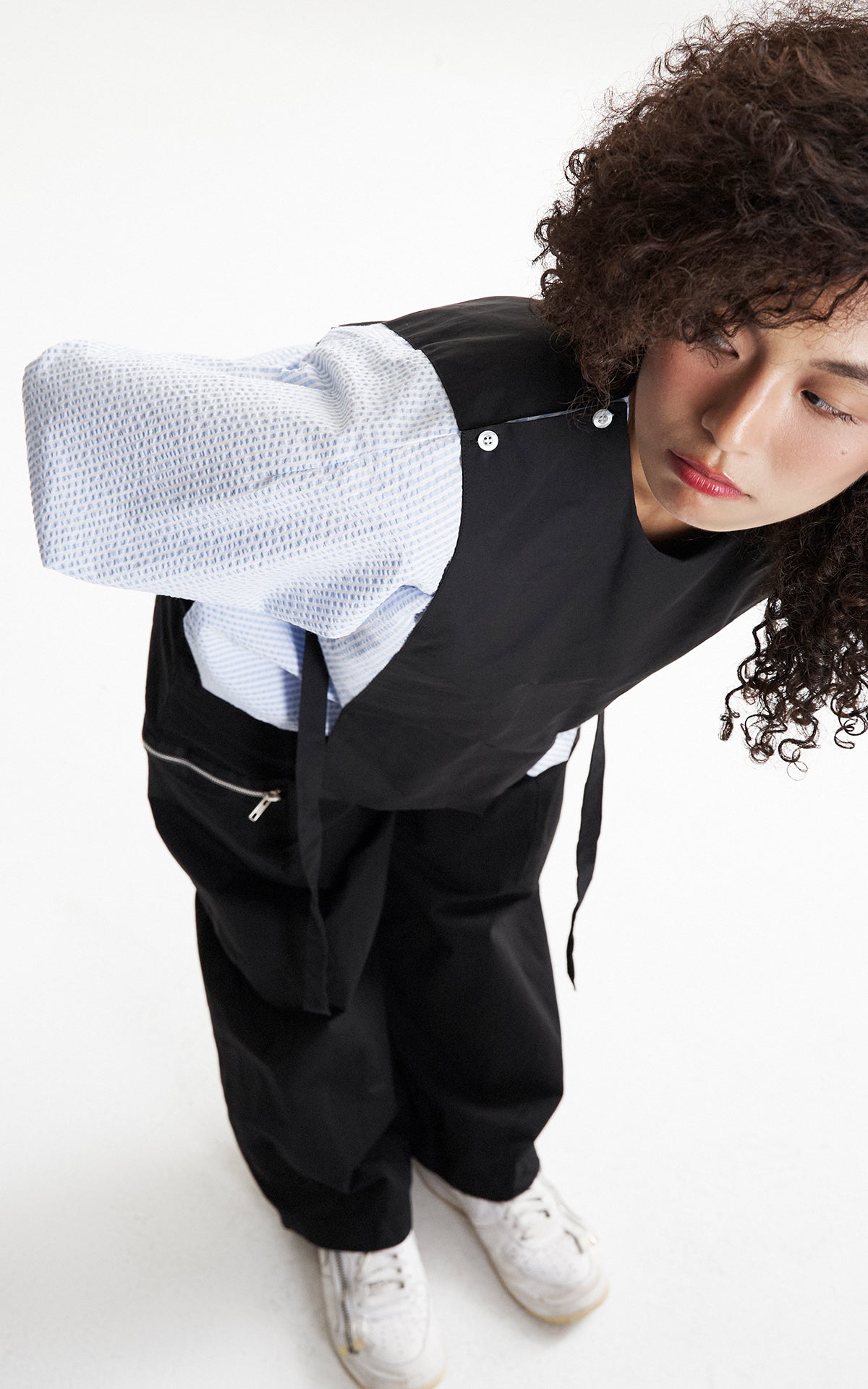 STRIDE Shirt is made with Seersucker + High Density Cotton. The main aesthetic of this shirt is the contrast between stripes and solid black, it’s like a perfect blend of dual-personality. Straps on the back section allows you to tighten to your liking. The STRIDE Shirt comes with hand pockets as well.