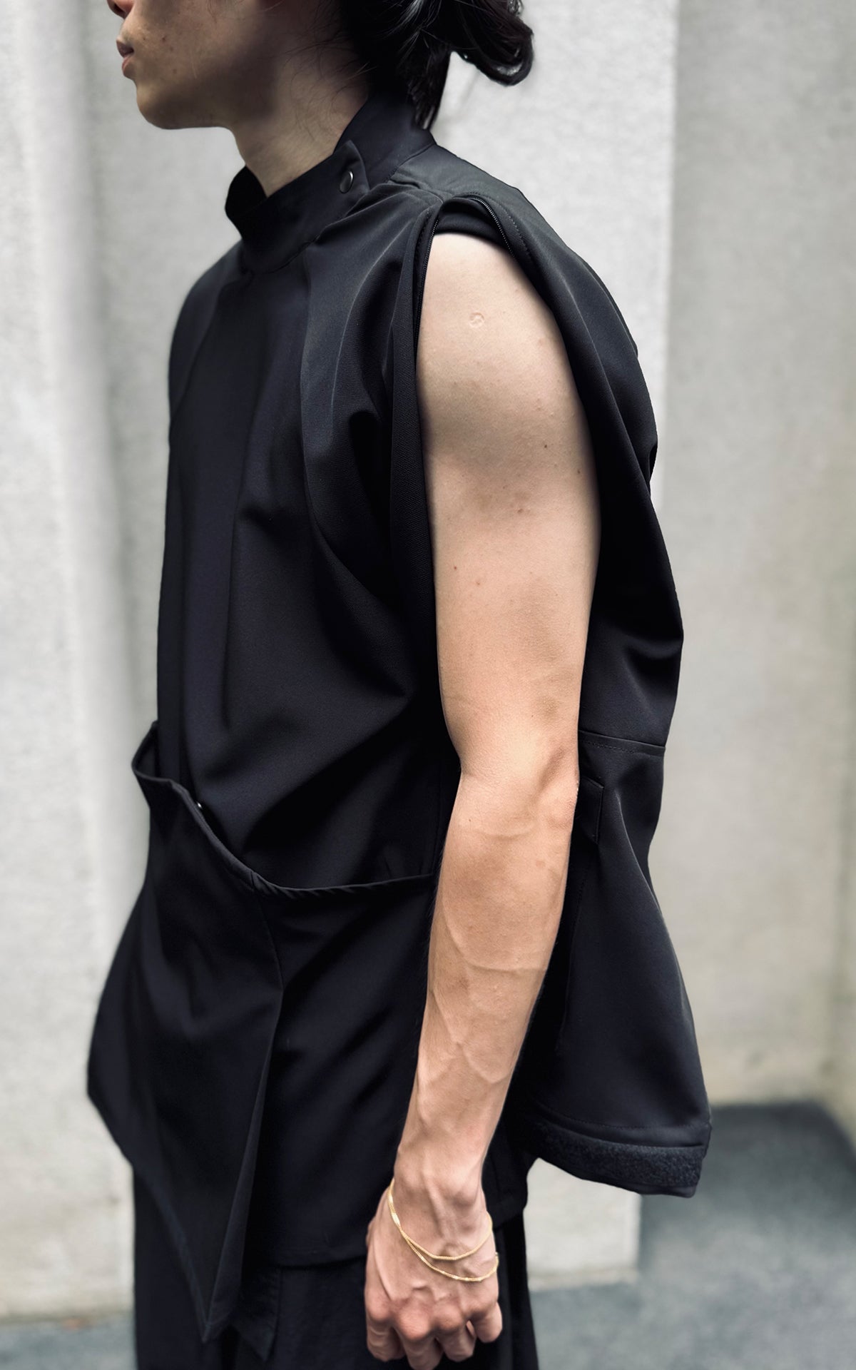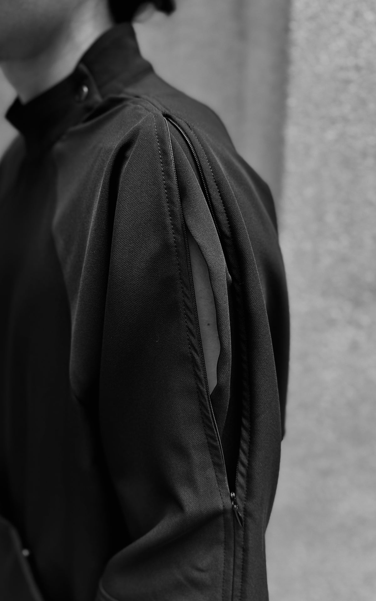 PROTRUDE is a versatile dual-mode jacket crafted from 4 way stretch fabric. It features discreetly concealed zippers on both sides for seamless armhole access. A spacious pleated pocket sits at the center, offering ample storage, while a compact arm pocket provides a secure spot for essentials up to phone size.