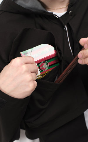 The LUNGS cropped jacket is designed with functionality and style in mind, featuring a 3L Waterproof Shell material for ultimate protection. Its standout feature is the pocket system: the flap allows access to two distinct pockets, while a longer “lung” pocket can be reached through a back slit with velcro. The sleeve openings are adjustable for a customized fit, and a spacious hand pocket is perfect for essentials like your phone or transit cards, making it ideal for commuters. The back panels are secured with snapped panel, ensuring that rainwater flows down rather than seeping in. To complete the look, the middle section of the chest is fastened with a YKK snap button, adding both style and security.