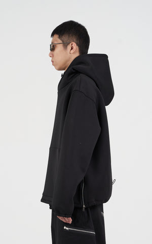 APEX is a loosefit overhead hoodie constructed with neoprene. APEX is made with a prominent silhouette with subtle details for everyday use. The sharp hoodie shape gives you a commanding look when you're trying to stay warm. YKK Zippers on the sides allow easy ventilation on-the-go. Finished off with an adjustable drawcord waist opening.