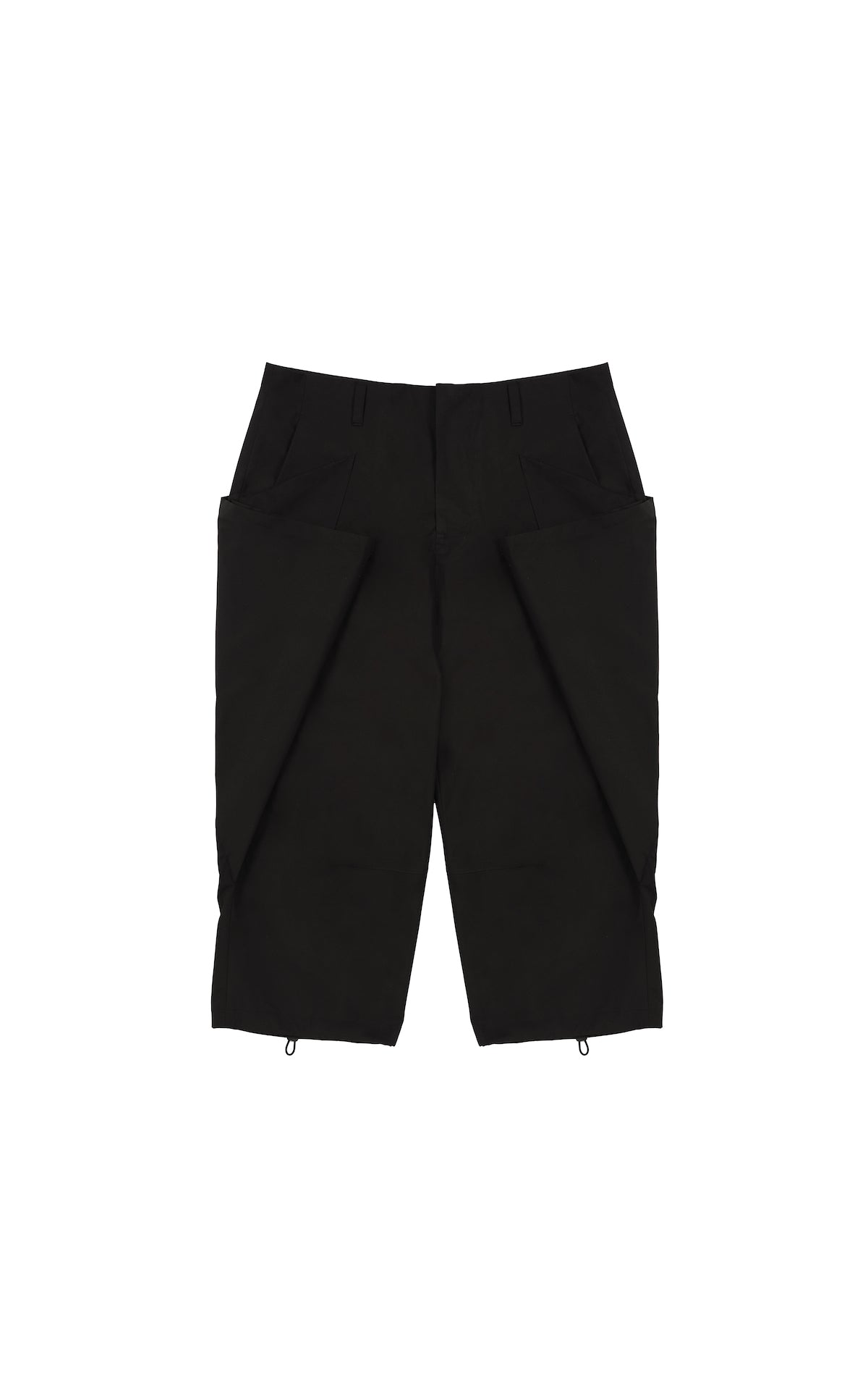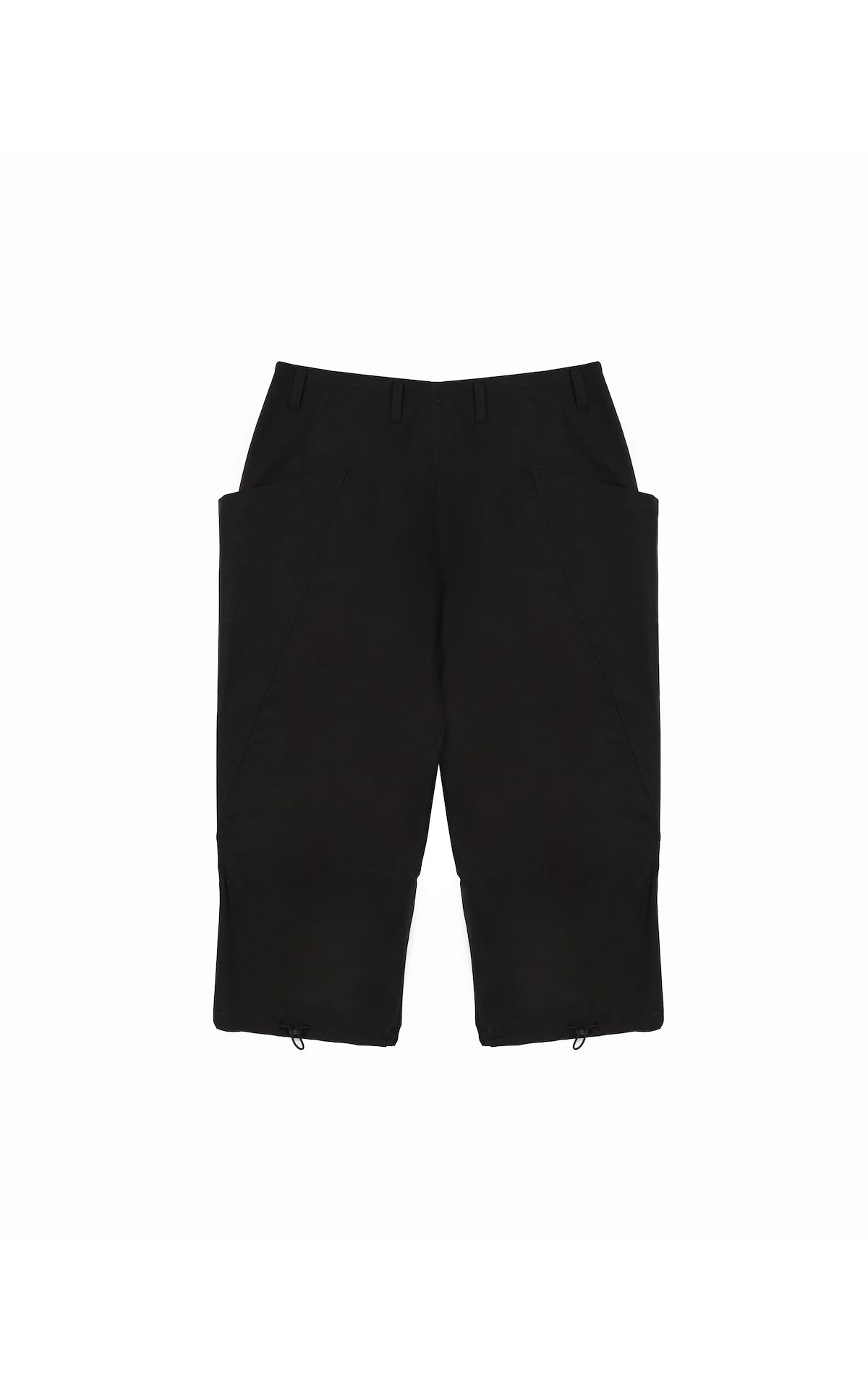 The PIZZA cropped pants is crafted from 3L Waterproof Shell material, combining practicality with playful design. The standout feature is the unique pizza-shaped pockets, spacious enough to carry a small child or your favorite plush toy. The pockets are secured seamlessly with a folded side profile and YKK snap buttons for a sleek look. A dedicated phone pocket is conveniently located on the right side of the larger pocket. To enhance the fit, the pants feature drawcord adjustable leg openings. With its distinctive silhouette, this pants effortlessly channel subtle Japanese street style swagger.