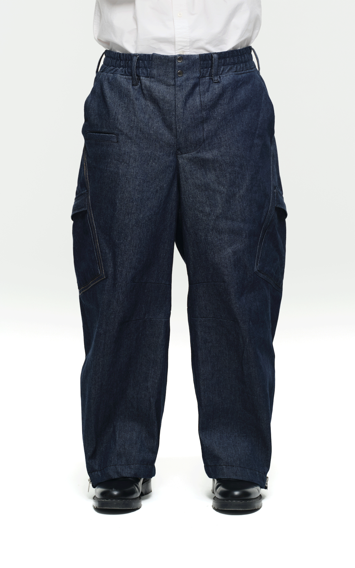 The “THUNDEROUS” Denim Pants are crafted from 100% heavyweight cotton for a durable yet comfortable fit. A contrast-colored thread runs along one side of the seam, adding a distinctive touch. Designed for utility, the pants feature two front pockets, two back pockets, two knee-side pockets, and a dedicated phone pocket on the right. The signature thunder-shaped side seams create a bold silhouette that stands out from every angle.